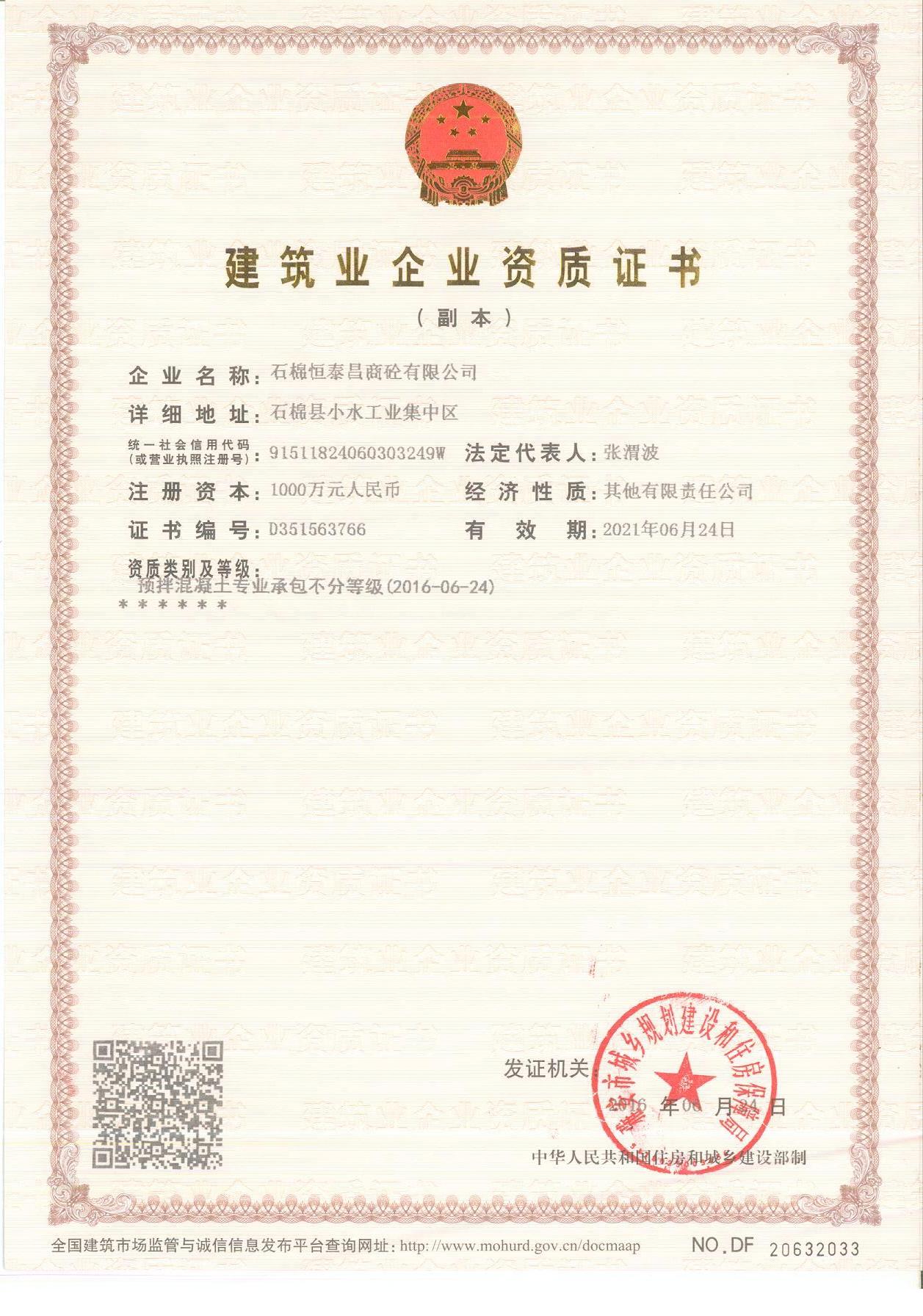 石棉恒泰昌有限公司于2012年 12月24 日取得了雅安市石棉县工商行政管理局核发的企业法人《营业执照》,公司企业法人营业执照统一社会信用代码为:91511824060303249W;注册资本:1000 万元;实收资本: 1000万元;公司住所:石棉县小水工业集中区;法定代表人:张渭波;经营期限:长期,即2012年12月24日至长期。经营范围:混凝土、新型建筑材料、编织袋、水泥、水泥熟料、水泥制品销售;砂石开采与销售。
