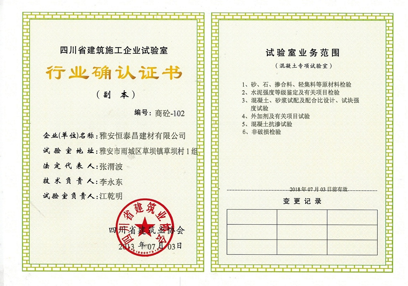 公司拥有雅安市城乡规划建设和住房保障局核发的预拌商品混凝土专业承包不分等级资质证书,质量管理体系谁证书、试验室行业确认证书等,并获得四川省建筑业协会颁发的优秀试验室荣誉证书。