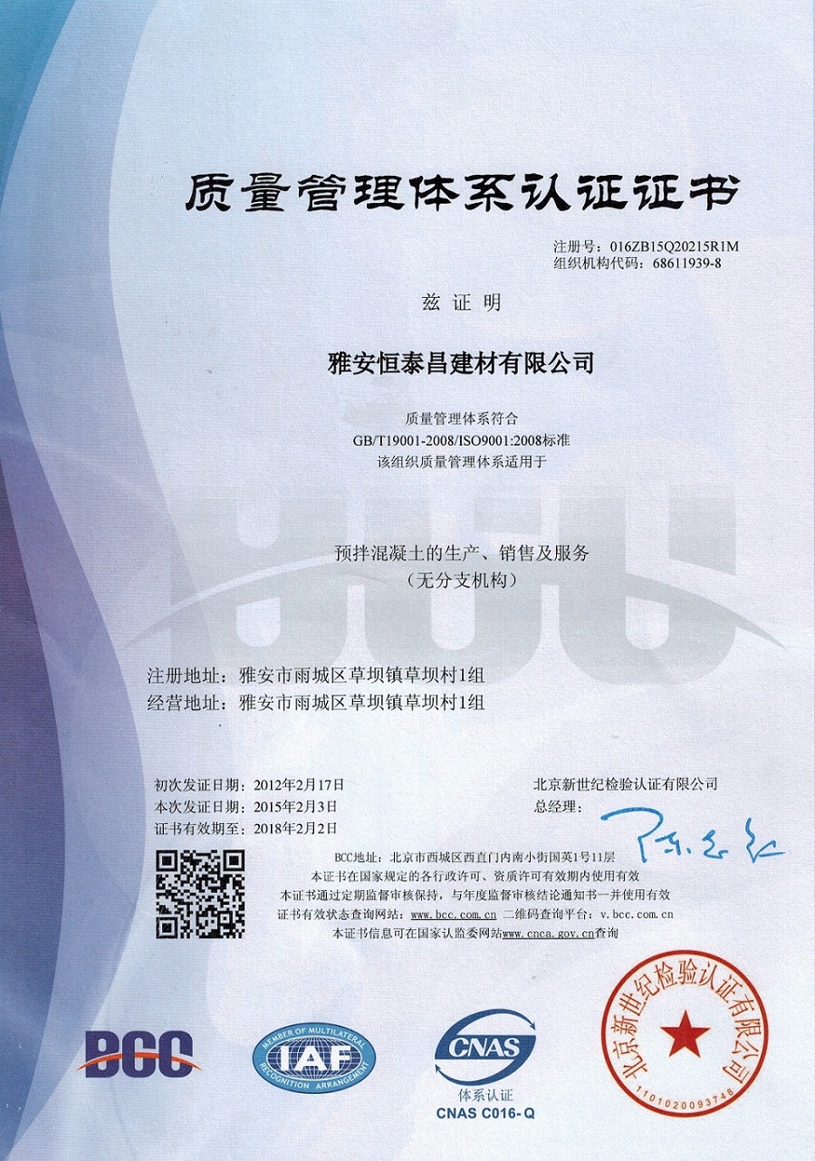 雅安恒泰昌建材有限公司成立于2009年3月,公司位于雅安市雨城区草坝镇雅安经济开发区,系四川恒泰昌实业集团有限公司全资子公司,是雅安市成立最早的、雨城区境内唯一一家规范的、具备专业资质的商品混凝土生产企业。我公司现已具备年产80万立方商品混凝土生产规模,拥有三一重工和中联重科HZ120生产线各一条、中联重科52米混凝土输送泵车和混凝土车载输送泵车各一台、各类型拖地泵6台、混凝土搅拌运输车辆28台,可保障混凝土多工地施工、场地集中浇筑和远距离大量供应的需要。我公司主要生产C10-C60等不同等级的商品混凝土,也可根据市场需要生产特种混凝土。同时,我公司是雨城区首家湿拌砂浆生产企业,主要生产用于砌筑、抹灰与地坪工程的M5-M20等不同等级的湿拌砂浆。现正在建设一条HZ90及两条HZ180生产线,计划2017年6开始逐步投入生产,年生产规模将达到180万立方商品混凝土。