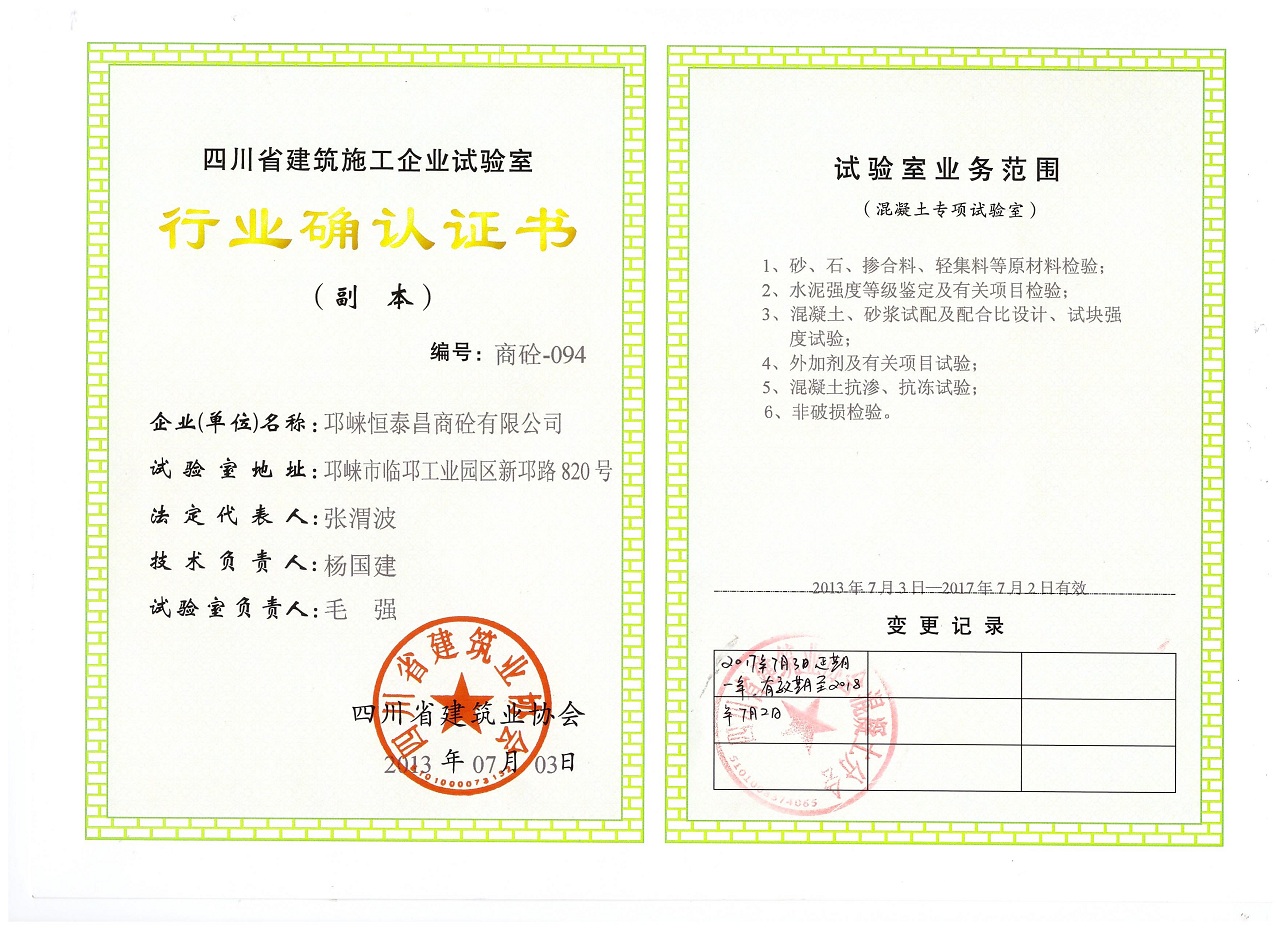 公司持有成都市城乡建设委员会颁发的《预拌混凝土专业承包》资质和《年产24万立方米湿拌砂浆备案》资质,已通过建设项目环保验收、建设项目安全设施审查、建设项目职业健康许可等相关政府批复文件,取得了混凝土专项试验室行业确认证书资质,以及通过了ISO9001:2008质量管理体系认证等。同时我公司是成都市混凝土协会会员单位,也是邛崃市建筑业协会理事会员单位、邛崃市建筑业协会混凝土分会会员单位。